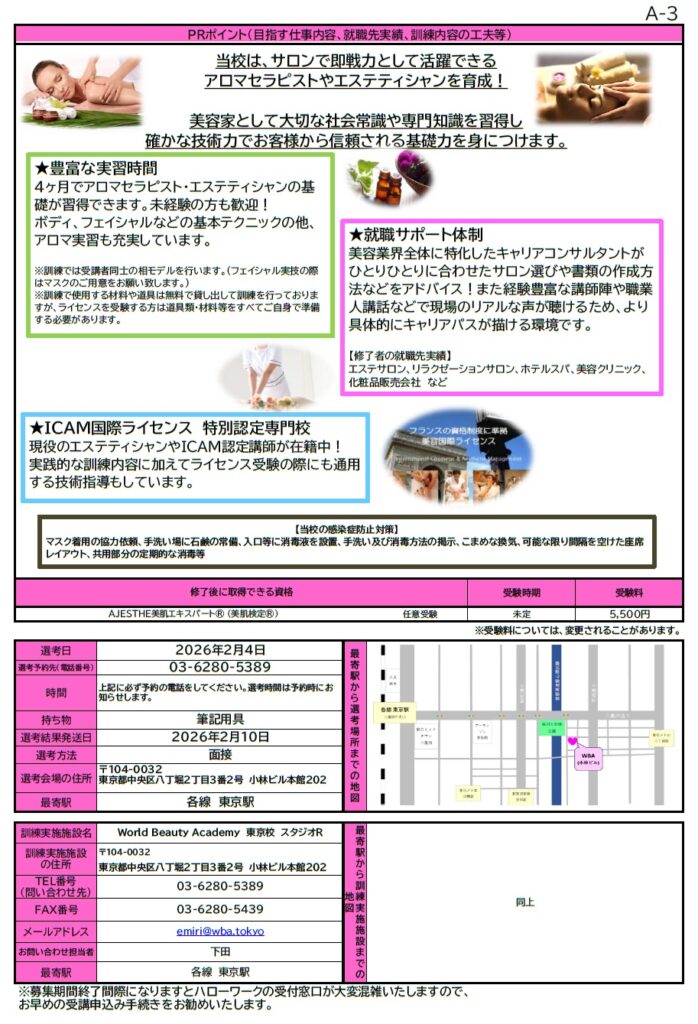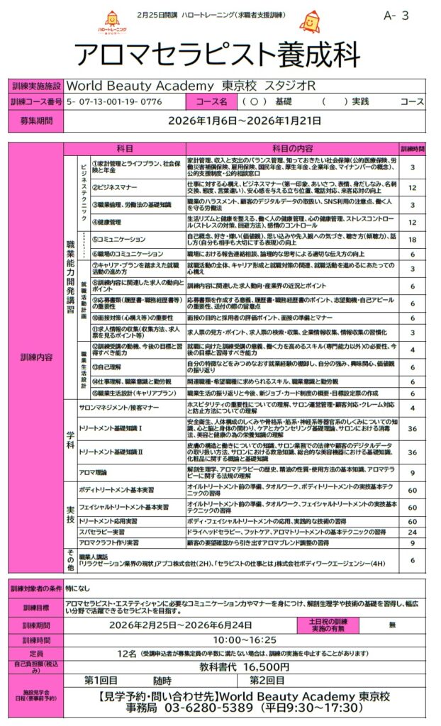 2月25日開講の「アロマセラピスト養成科」の訓練生を募集しています!